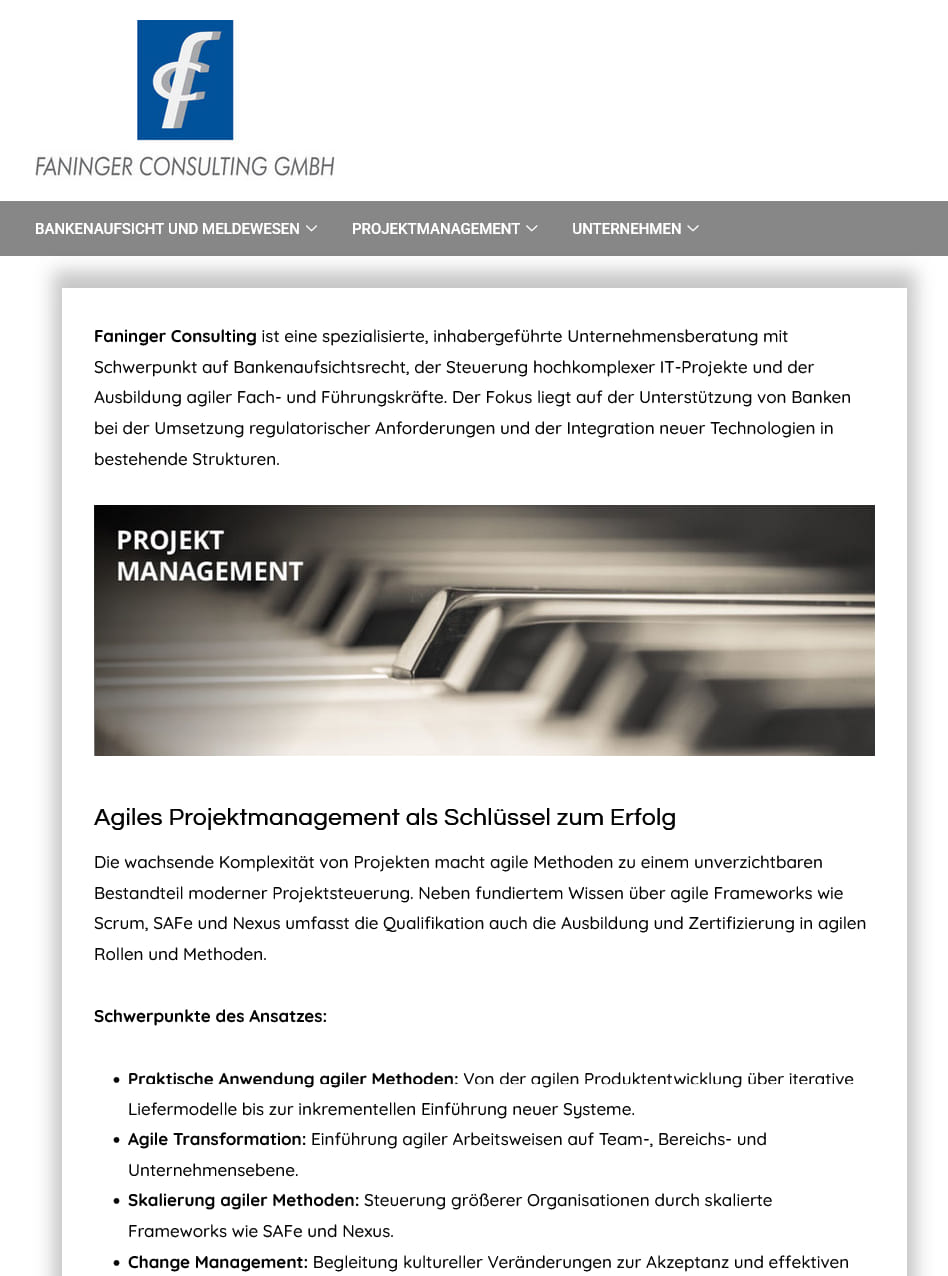 Faninger Consulting is a specialized, owner-managed management consultancy with a focus on banking supervision law, the management of highly complex IT projects and the training of agile specialists and executives.